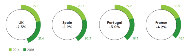 Quando se comparara o número de ocasiões semanais de consumo de alimentos e bebidas em casa, há dois grupos distintos: países onde as pessoas se alimentam no domicílio três vezes por dia e aqueles em que as pessoas só o fazem duas vezes. O snacking – o lanche feito no intervalo das refeições principais – é o fator mais relevante para o entendimento das diferenças entre os mercados. O hábito de petiscar é quase três vezes maior no Reino Unido, onde as pessoas comem em casa três vezes por dia, do que na França, onde a frequência é de duas vezes.